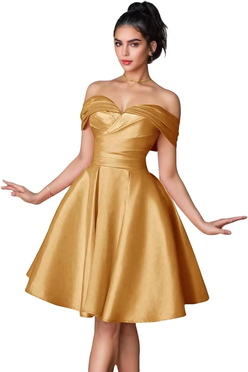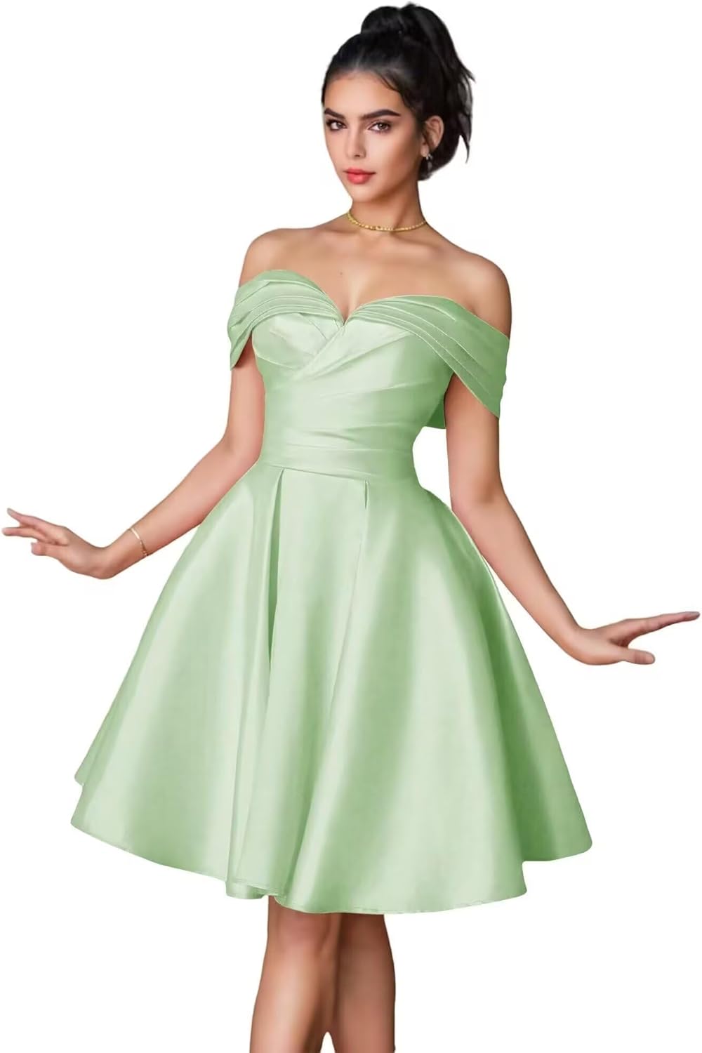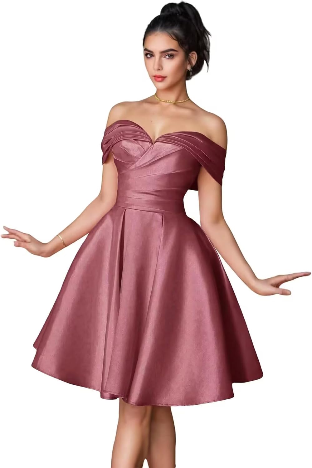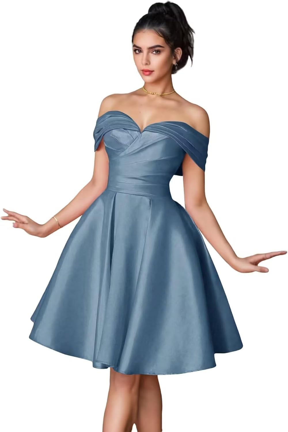Dress Name: Short satin v neck off-the-shoulder homecoming dress Features: Off shoulder v-neck a-line pleated mini formal party gown with lace upFabric Type: SatinSilhouette: A-lineDecorations: PleatedStraps: Off shoulderSleeves: SleevelessLength: ShortBack: Half open backClosure: Lace upWith Slit: NoTrain: NoCustom Size: In addition to standard sizes, we also offer custom sizes, if you need to custom the dress, please send us your measurements of bust, waist, hips, height.
