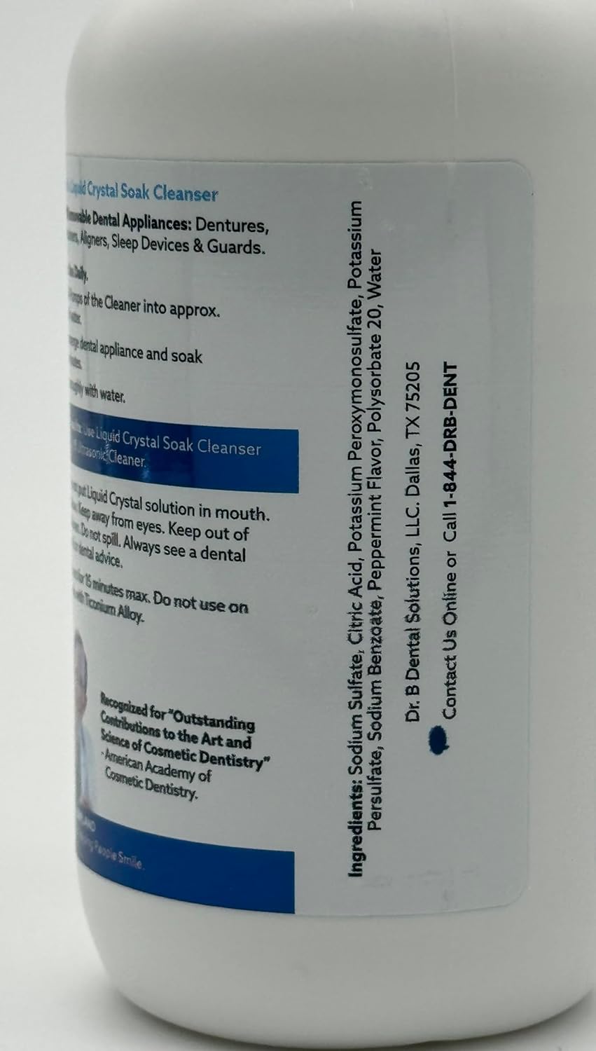 Upgrade your dental appliance care with the Dr. B Dental Solutions Ultrasonic Dental Cleaner and Liquid Crystal Soak Cleanser Bundle, a comprehensive cleaning system designed to provide thorough and efficient cleaning for dentures, night guards, retainers, aligners, and more. The Ultrasonic Dental Cleaner employs high-frequency ultrasonic waves to break down stubborn debris and biofilm, ensuring your dental appliances are spotless. With adjustable cleaning cycles of 5, 10, or 15 minutes and an automatic shut-off function, this cleaner offers ease and convenience, whether at home or while traveling. Its compact, space-saving design ensures it fits seamlessly into any routine. Paired with the Liquid Crystal Soak Cleanser, you’ll enjoy 99.99% pathogen eradication, providing complete protection against bacteria, viruses, and other harmful microbes. This gentle yet powerful formula contains no harsh chemicals like bleach, alcohol, or chlorine, ensuring your appliances stay in top condition without any risk of discoloration. Whether you're at home or on the go, this bundle is the ultimate solution for maintaining clean, fresh dental appliances, giving you the confidence of a healthy smile every day.