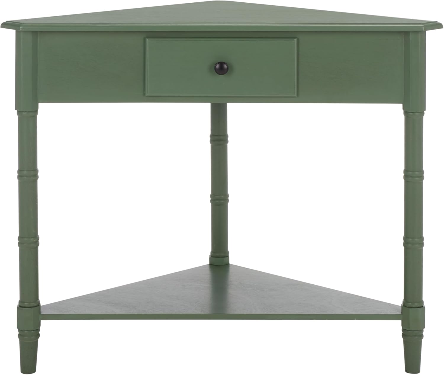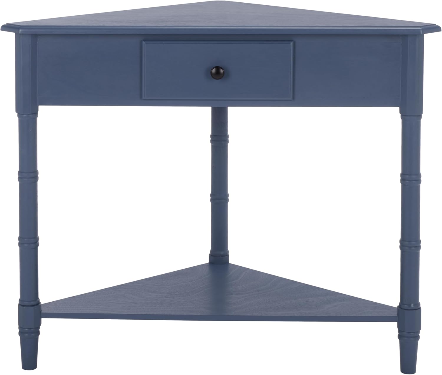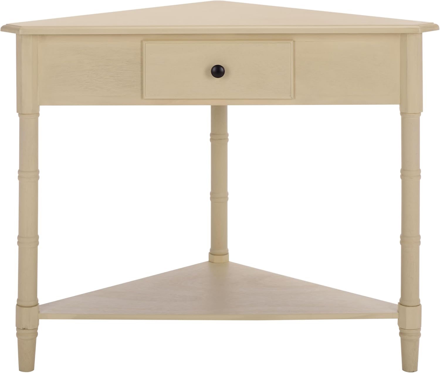 The SAFAVIEH Gomez Corner Table in distressed cream offers a smart, space-saving solution designed to bring both function and charm to smaller interiors. Its triangular pine wood frame fits effortlessly into corners, helping maximize floor space while still providing practical storage. A smooth-glide drawer keeps everyday essentials neatly tucked away, while the lower shelf offers an ideal spot for books, decorative accents, or storage baskets. Finished in a softly distressed cream tone with bamboo-inspired legs, this table blends seamlessly with farmhouse, cottage, coastal, and transitional décor styles. Crafted from natural pine wood and finished by hand, subtle variations in color may occur, enhancing the character and individuality of each piece. Perfect for apartments, bedrooms, living rooms, or entryways, the Gomez Corner Table combines thoughtful design with timeless appeal.