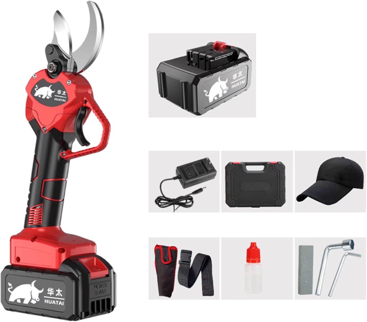 Features: 500W high-power brushless motor with strong power. With 1/2/3 rechargeable lithium batteries, you can choose to buy according to your needs. Ergonomic non-slip handle for easy and comfortable grip. Specification: Battery capacity: 39800mAh rechargeable lithium battery Battery voltage: 98VF Charging voltage: AC110V-240V Charging time: About 1-2 hours Working time: About 3-4 hours Peak power: 650W Maximum shear diameter: 50mm Blade material: SK5 carbon steel What you can get: Electric pruning shears (without battery)* 1, lithium battery* 1/2/3, charger* 1, user manual* 1, wrench* 2, sharpening stone* 1, hat* 1, waist bag* 1, portable Box * 1 If you have any questions about our products, please feel free to contact us, we will reply you within 24 hours.
